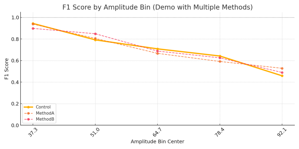 - Per-bin F1 score analysis across amplitude bins